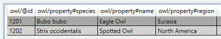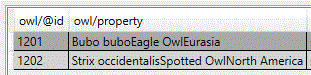 You select <owl> as the master element. The default setting for the repeating <property> element is Concatenate, which results in the following database table.
