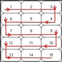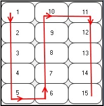 Vertical (Alternating): Items are printed column by column, with the first column being printed from either the top or the bottom side of the stock, depending on the starting corner, and with each subsequent column being printed from the same side (top or bottom) on which the printing ended for the previous column. The following image shows the order in which items are printed when you select Vertical (Alternating) with a Starting corner of Top Left.