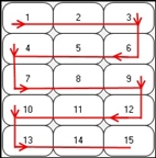 Horizontal (abwechselnd): Die Elemente werden zeilenweise gedruckt, wobei die erste Zeile je nach Ausgangsecke entweder von der linken oder von der rechten Seite des Bestands aus gedruckt wird. Der Druck der nachfolgenden Zeilen wird an der Seite fortgesetzt, an der der Druck der vorherigen Zeile endete. Das folgende Bild zeigt die Reihenfolge, in der die Elemente gedruckt werden, wenn Sie Horizontal (abwechselnd) mit der Ausgangsposition oben links wählen.