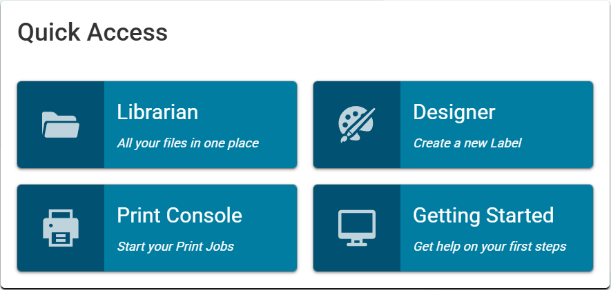 The Quick Access section of the Home page displays four buttons that give you direct access to Librarian, Designer, and Print Console, as well as a button that takes you straight to the Getting Started section of BarTender Cloud's documentation set.