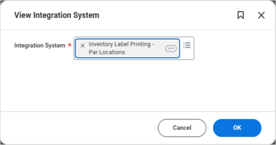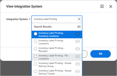 In the View Integration System dialog, search for Inventory Label Printing and select the inventory label type you would like to configure.